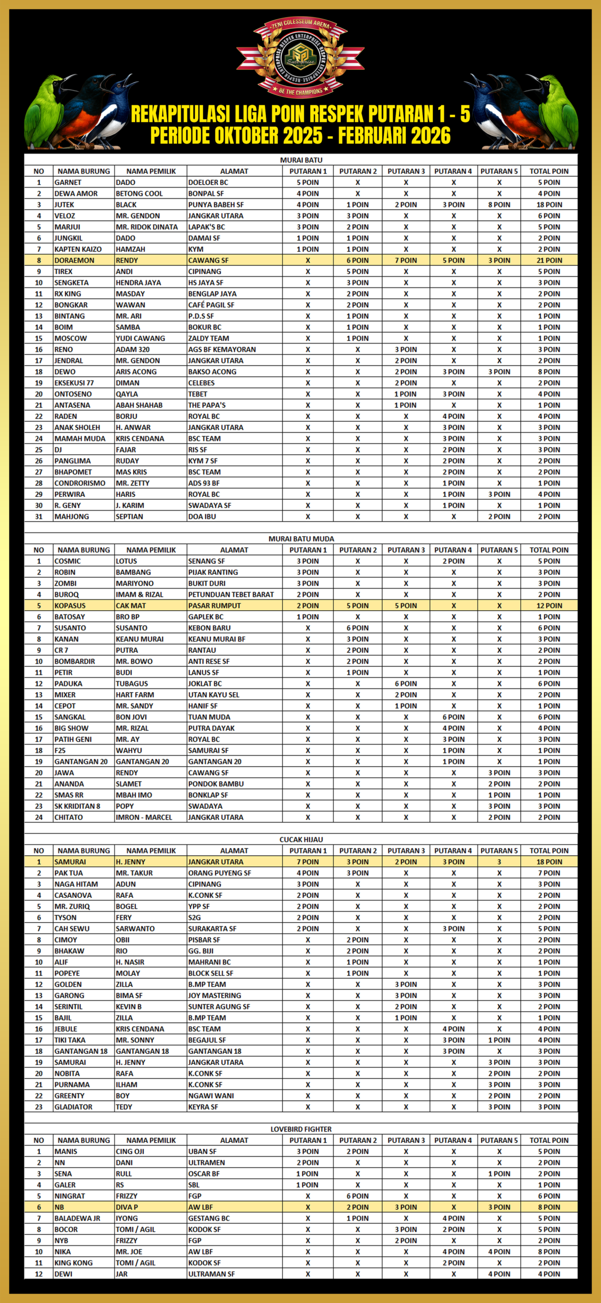 Rekap total poin liga dari putaran pertama hingga putaran kelima dari kelas Murai Batu ada Doraemon unggul dengan total poin 21 poin, murai besutan Rendy Cawang SF tersebut berhasil mendominasi poin dari putaran kedua. Disusul dengan Jutek gaco dari Black Punya Babeh SF yang sikat posisi runner up, dengan total 18 poin. berikutnya ada Dewo yang bertengger diposisi ke tiga pada liga kali ini dengan total poin 8 poin.