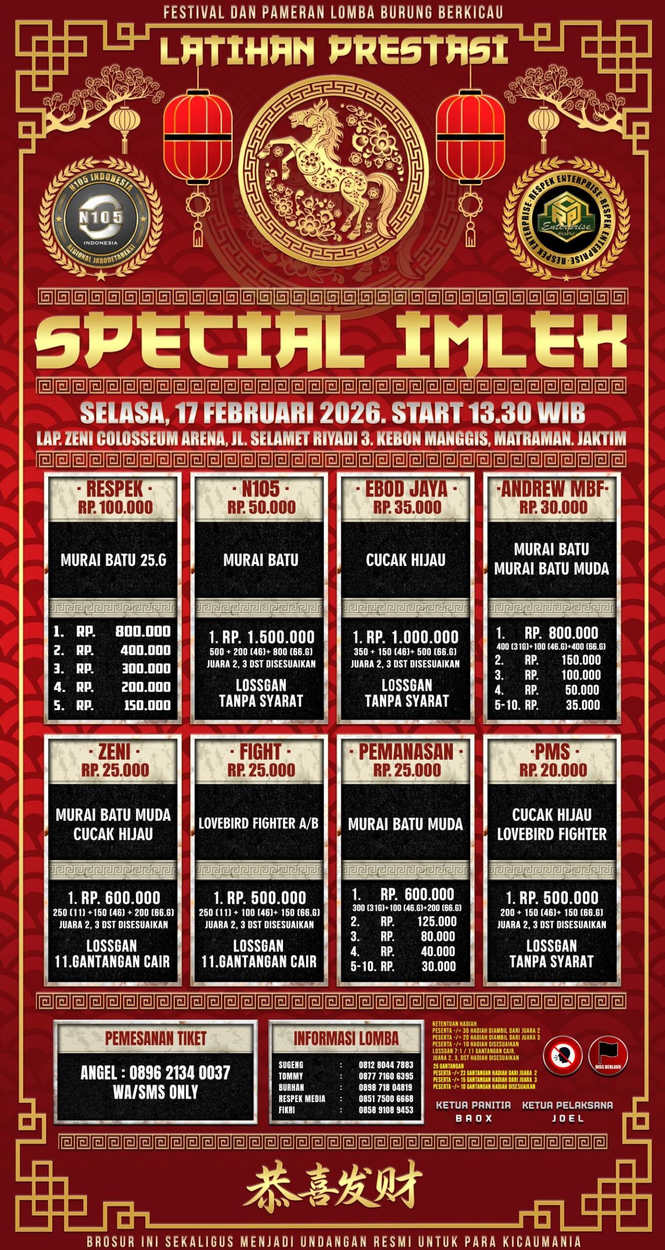 Menurut Joel, selaku ketua N105 regional Jabodetabeksi, program atau gelaran ini sengaja diadakan untuk memeriahkan tahun baru imlek dan mengisi waktu luang liburan untuk para kicaumania. ” Ya, biar bisa menjangkau seluruh lapisan, jadi kami buat dengan konsep yang merakyat, tentunya dengan hadiah yang menarik dan ga kaleng – kaleng. ” ujarnya disela gelaran latber rutin sabtu Respek Enterprise. (Fai)