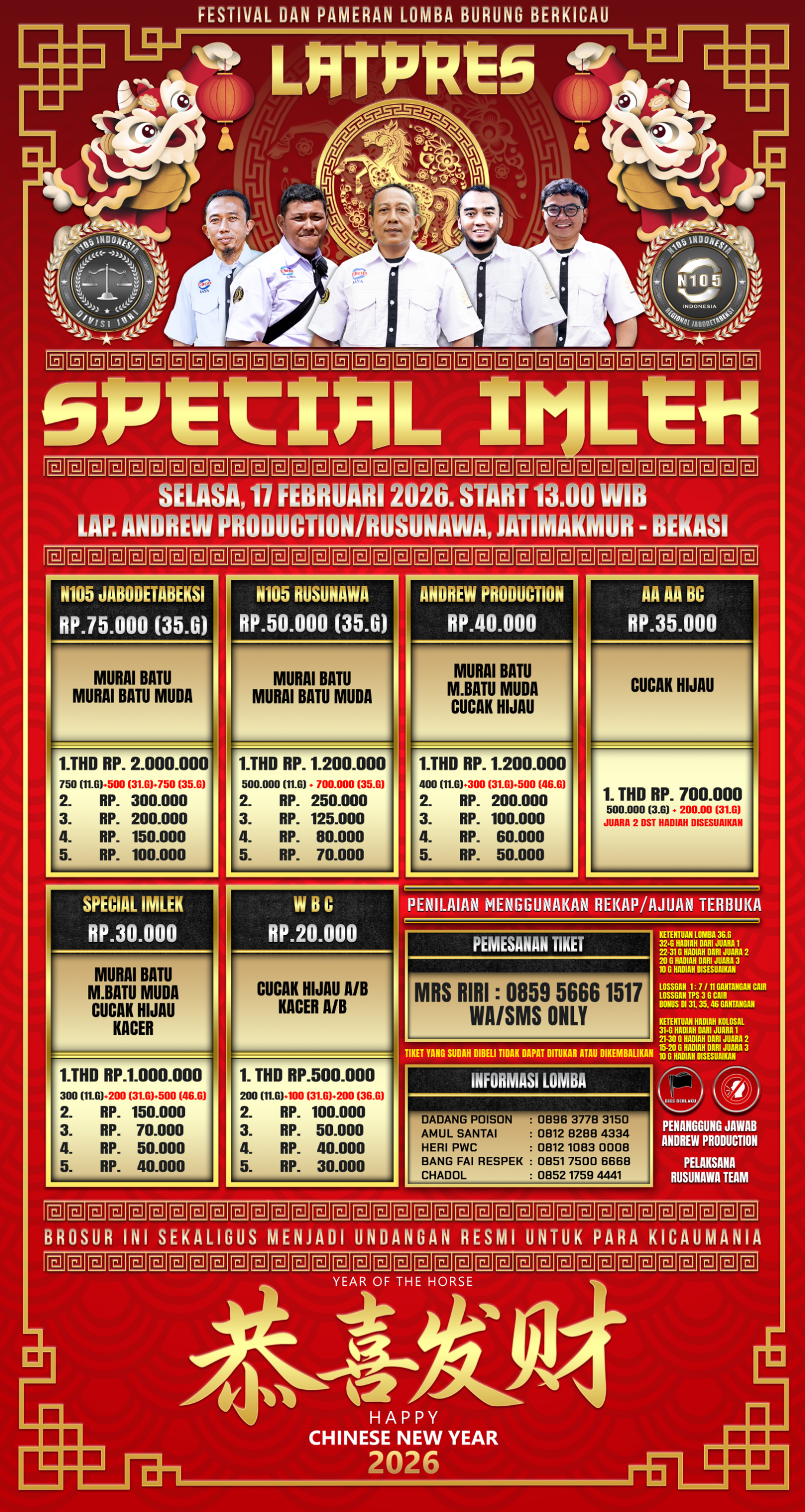 N105Media.com. Unruk menyambut tahun baru imlek, N105 Jabodetabeksi yang bekerja sama dengan Respek Enterprise dan Andrew Production/Rusunawa, akan menggelar sajian special yang bertemakan imlek, dengan kemasan tiket yang menjangkau seluruh kalangan kicaumania.